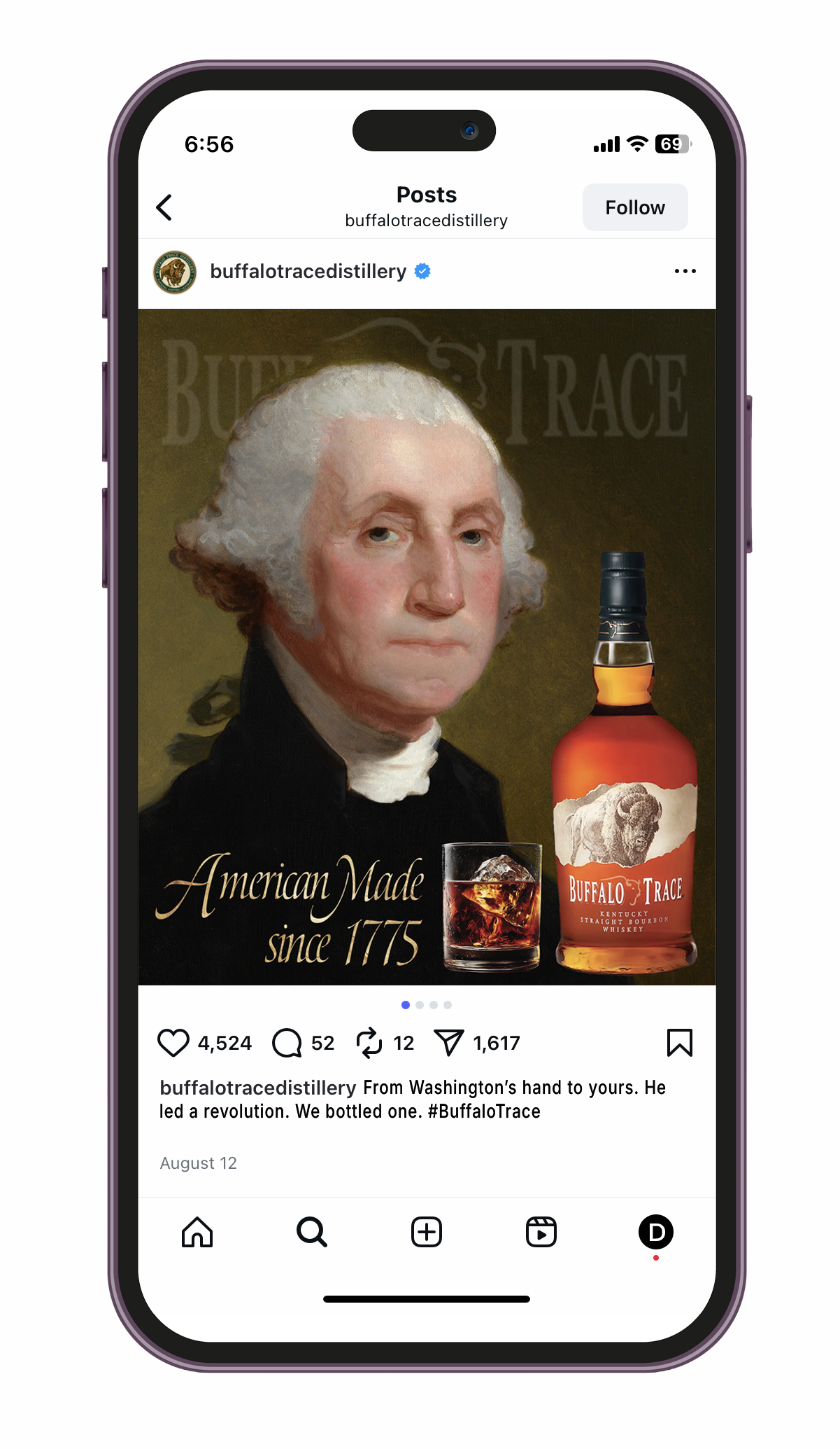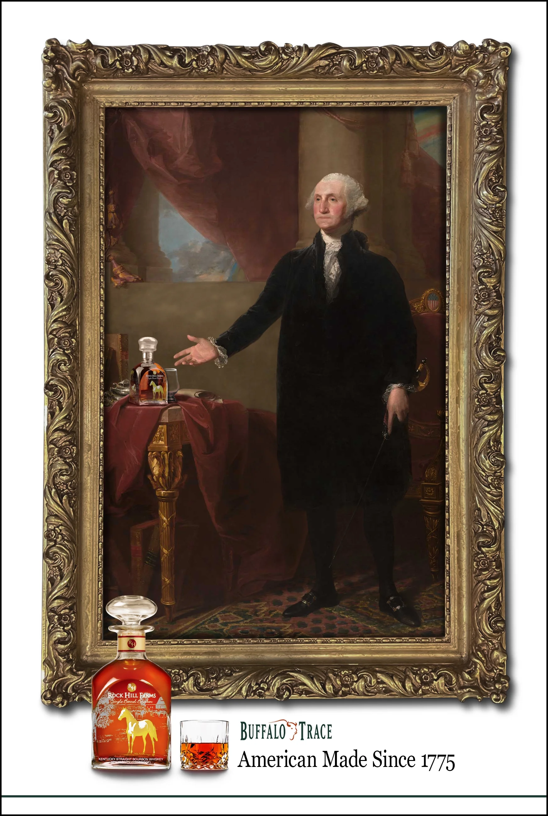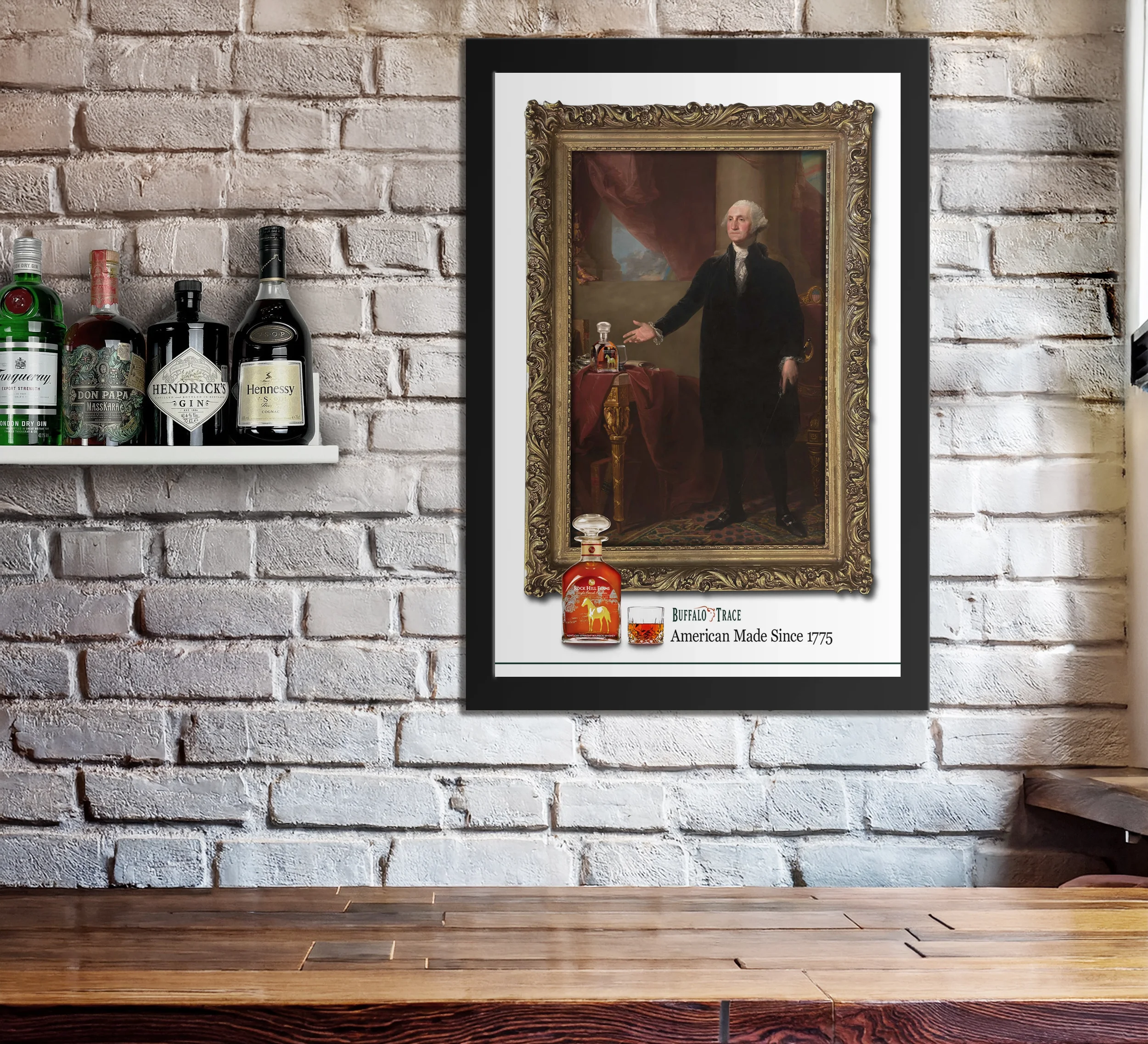 The modified painting of George Washington was cropped in a flowing line that complements the silhouette of the Buffalo Trace logo. The right side would be hand painted by an artist and features the brand colors, wordmark, and campaign tagline. An additional marketing slogan was added to distinguish this aspect of the campaign and increase the advertisement’s stickiness.
