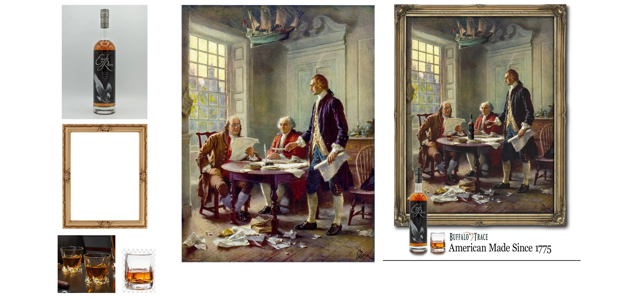 Product placement within the painting involved adding the bottle in the middle of the table as well as adding 3 glasses for the figures. For John Adams and Thomas Jefferson, some masking was applied to place the glasses in their hands. For the tilted glass, the whiskey was repainted to match the natural angle in the image. Some environmental shadows, canvas textures, and object highlight/shadows were added to better integrate them into the painting.
