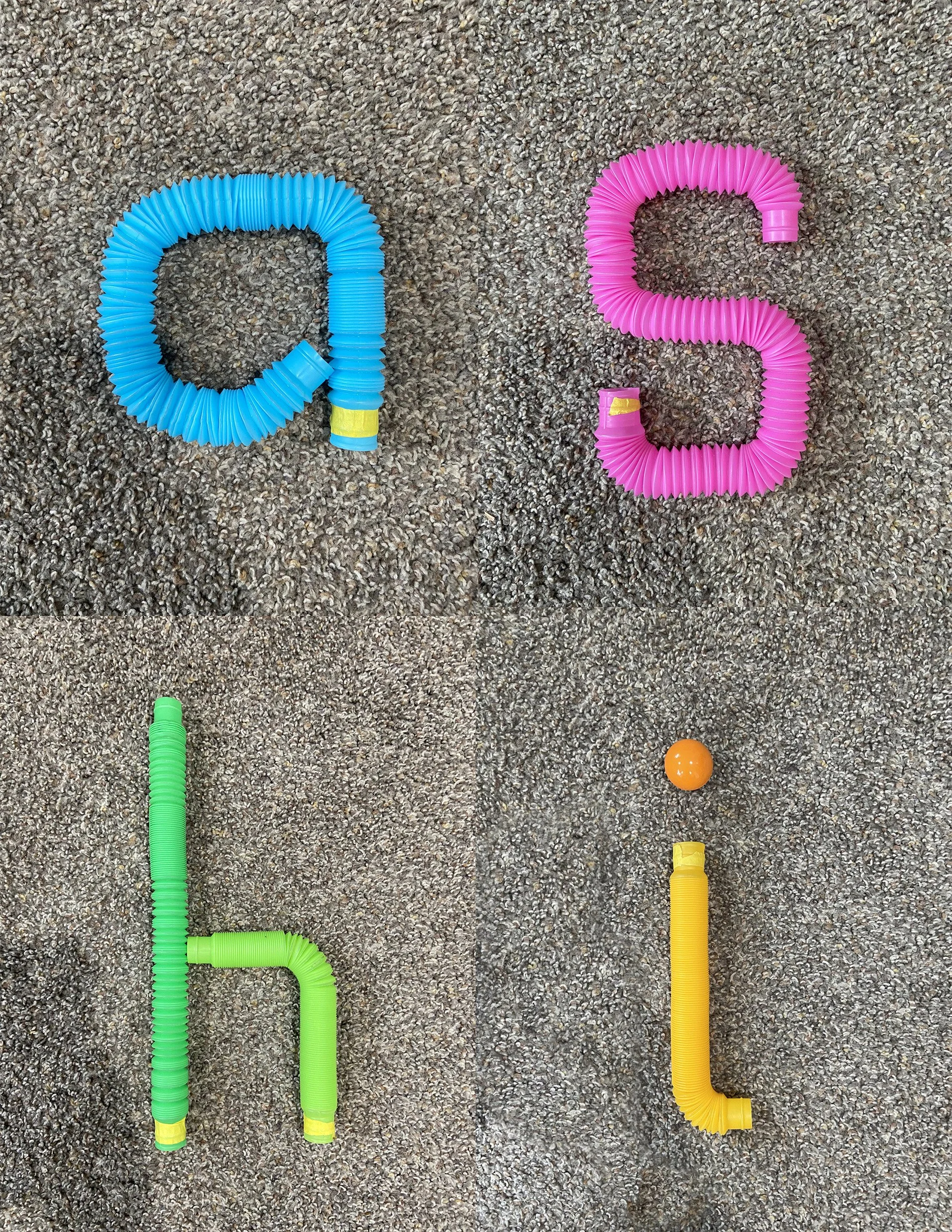 Eventually, one of my two-year old son’s toys seemed promising. They were flexible, expandable plastic hoses with little bibs at the ends that could be connected together. The material and innate functionality of these toy hoses shaped a unique letterform language. It created natural curves and connections endemic to the material itself, which meant I wasn’t pushing the letters into a material. The material was shaping the letters and crafting a visual language native to the hoses.
