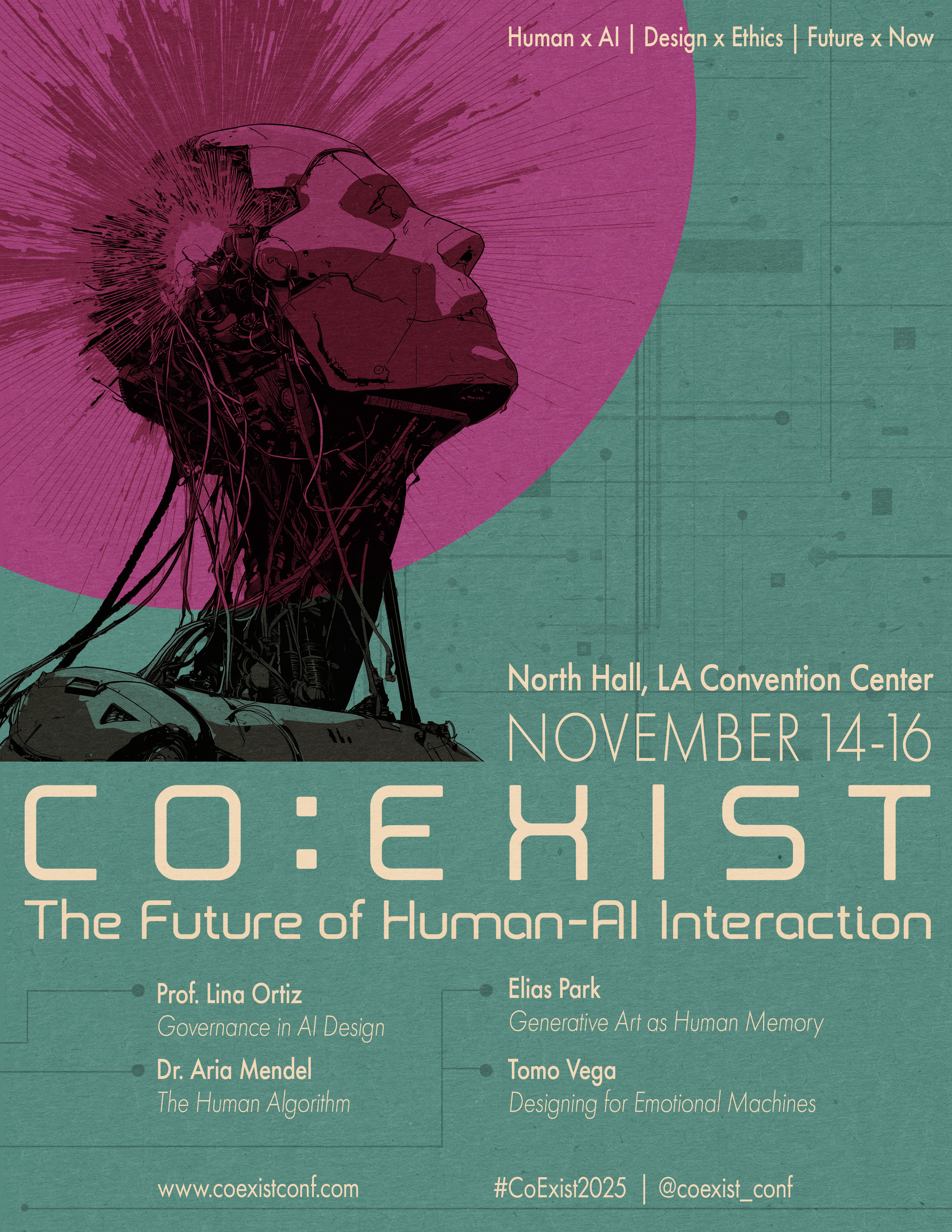In this example, the typeface is used in the title and subtitle for a digital or printed poster that is advertising for a fictional convention about the relationship of humanity and AI.