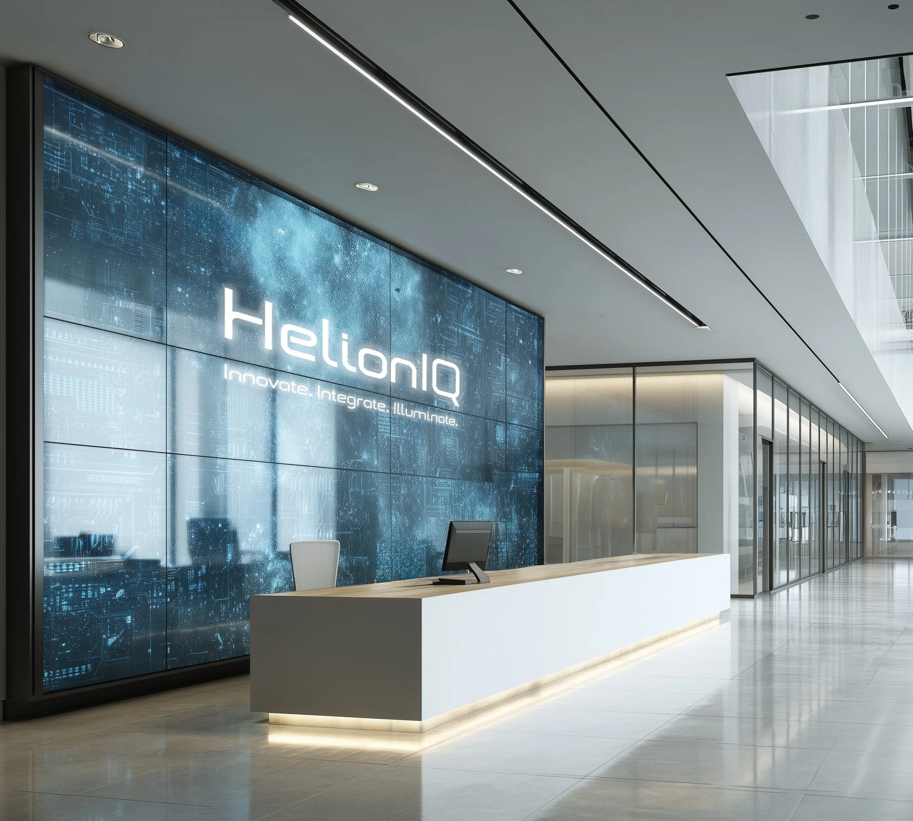 This mockup shows the typeface being used in branding as part of the branding identity of a fictional tech company called HelionIQ.