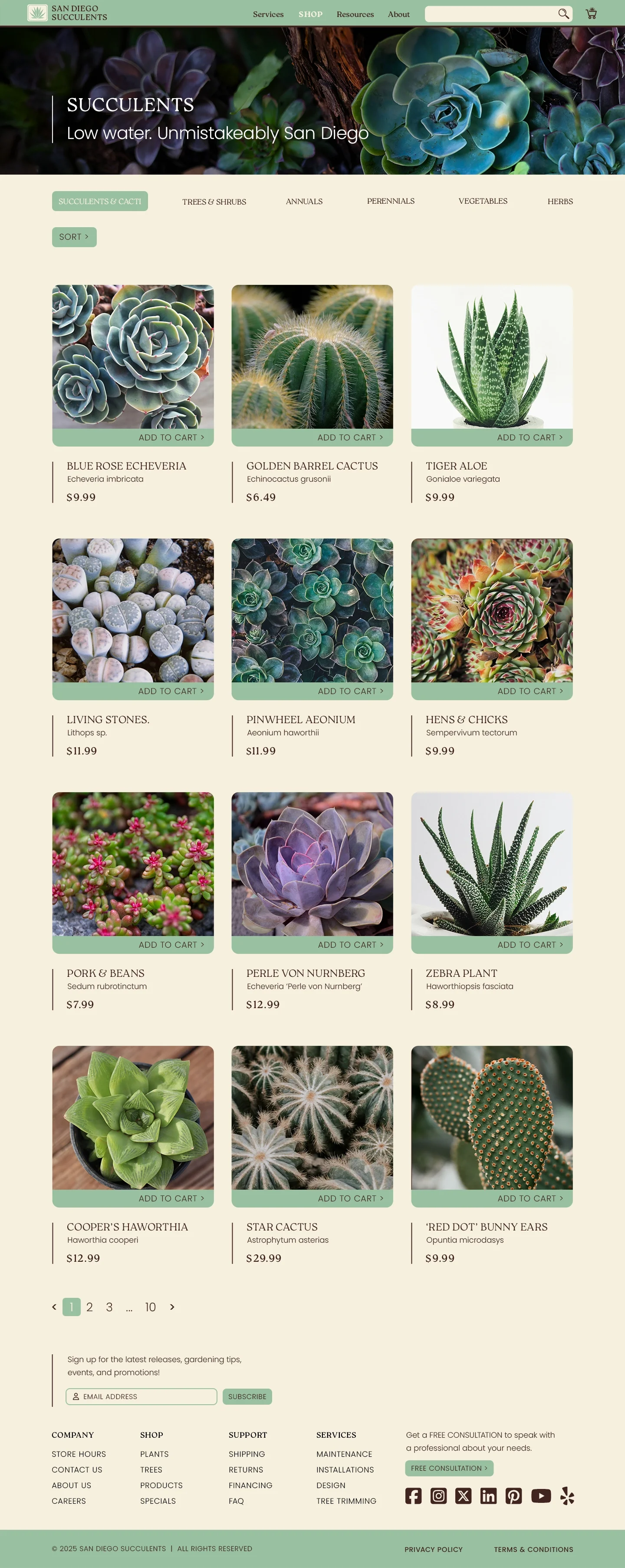 When different sections are selected in the navigation bar, the section is highlighted for navigation reference by turning the text into the ivory color and making the letters into all caps. A similar method is used in other cases in which buttons turn the text from brown to ivory to show they are selected as seen on the PLP page below highlighting the “Succulents & Cacti” page.